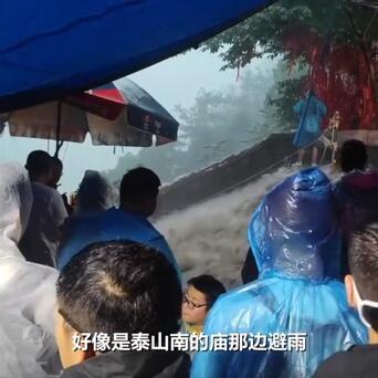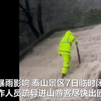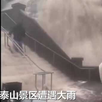 【泰山景区暴雨山路变瀑布:游客下山鞋子险被冲掉】8月7日,泰山景区遭遇大雨,水流从台阶倾泻而下。受暴雨影响,泰山景区7日临时闭园,工作人员疏导进山游客尽快出园。
